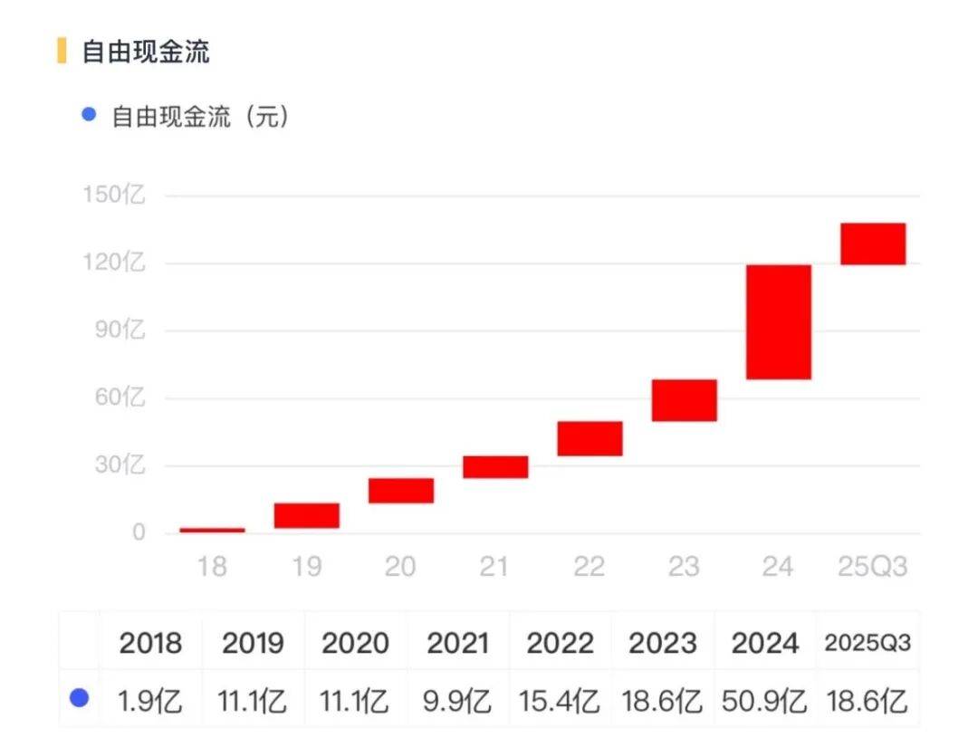 从业制血能力强劲的环境下,笼盖掉本钱开支后,公司每年沉淀的现金流也正在逐年递增,2024年达到51亿元,2025年前三季度也有19亿元。毫不夸张地说,公司已具备“现金奶牛”属性。