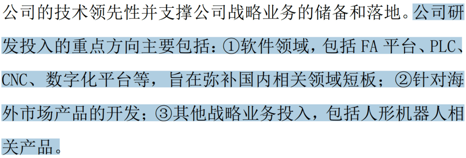 正在2025年12月的投资者调研中,公司就暗示后续的研发投入标的目的包罗FA平台、PLC、CNC、数字化软件平台等,旨正在填补国内相关范畴短板;以及针对海外市场产物的开辟和人形机械人等产物。