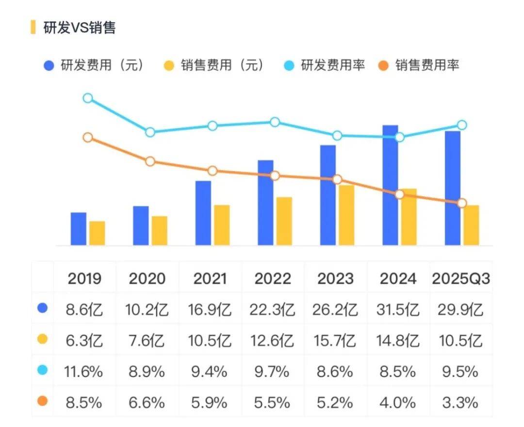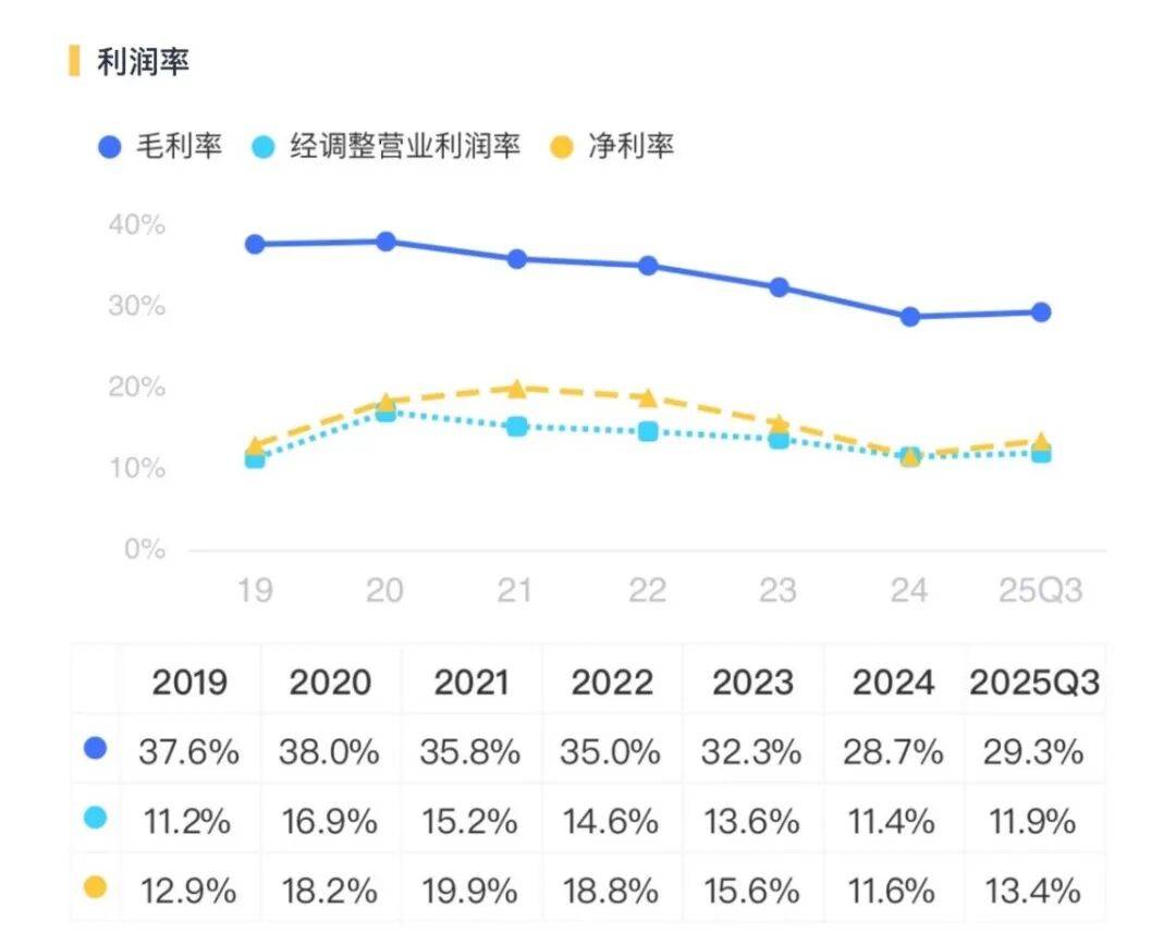 从焦点盈利能力来看,2025Q3,公司毛利率为29。3%,较2024年提高约1个百分点,呈现企稳迹象。同期,公司经调整停业利润率为11。9%,净利率为13。4%,较2024年提高了约两个百分点,回升较着。