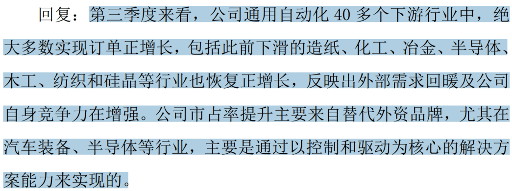 公司市占率提拔次要来自替代外资品牌,特别正在汽车配备、半导体等行业,次要是通过以节制和驱动为焦点的处理方案能力来实现的。