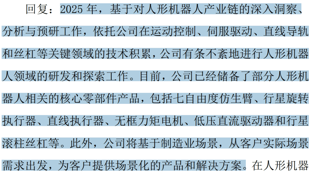 2025年9月,汇川正在工博会上正式发布七度仿生臂、扭转施行器、曲线施行器、无框力矩电机、低压曲流驱动器及滚柱丝杠等多款焦点部件,产物正在扭矩密度、热不变性取寿命方面达到行业领先程度,具备规模化量产能力。