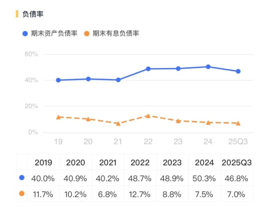 2025Q3,公司的期末有息欠债率为7%,连结继续压降趋向!