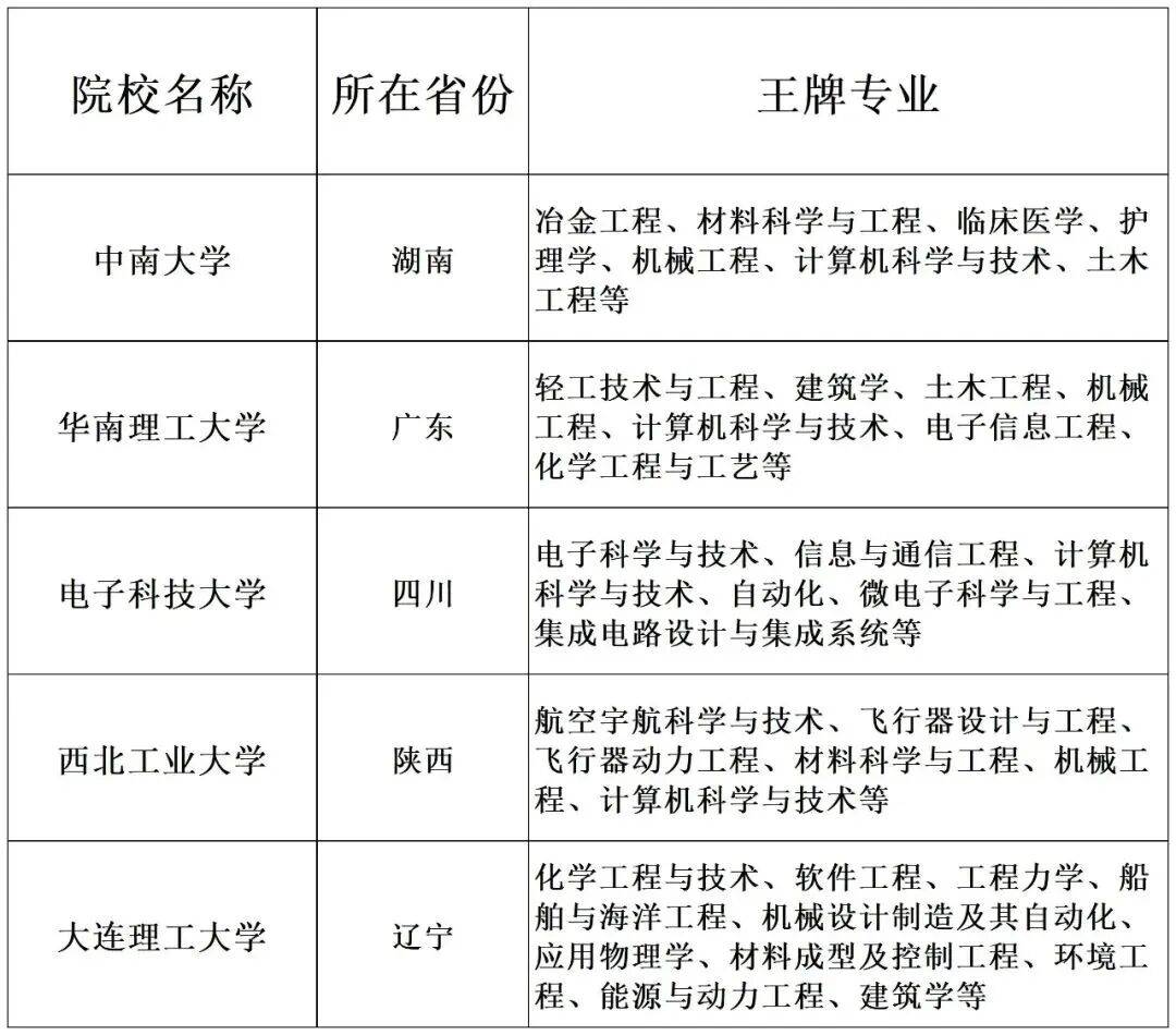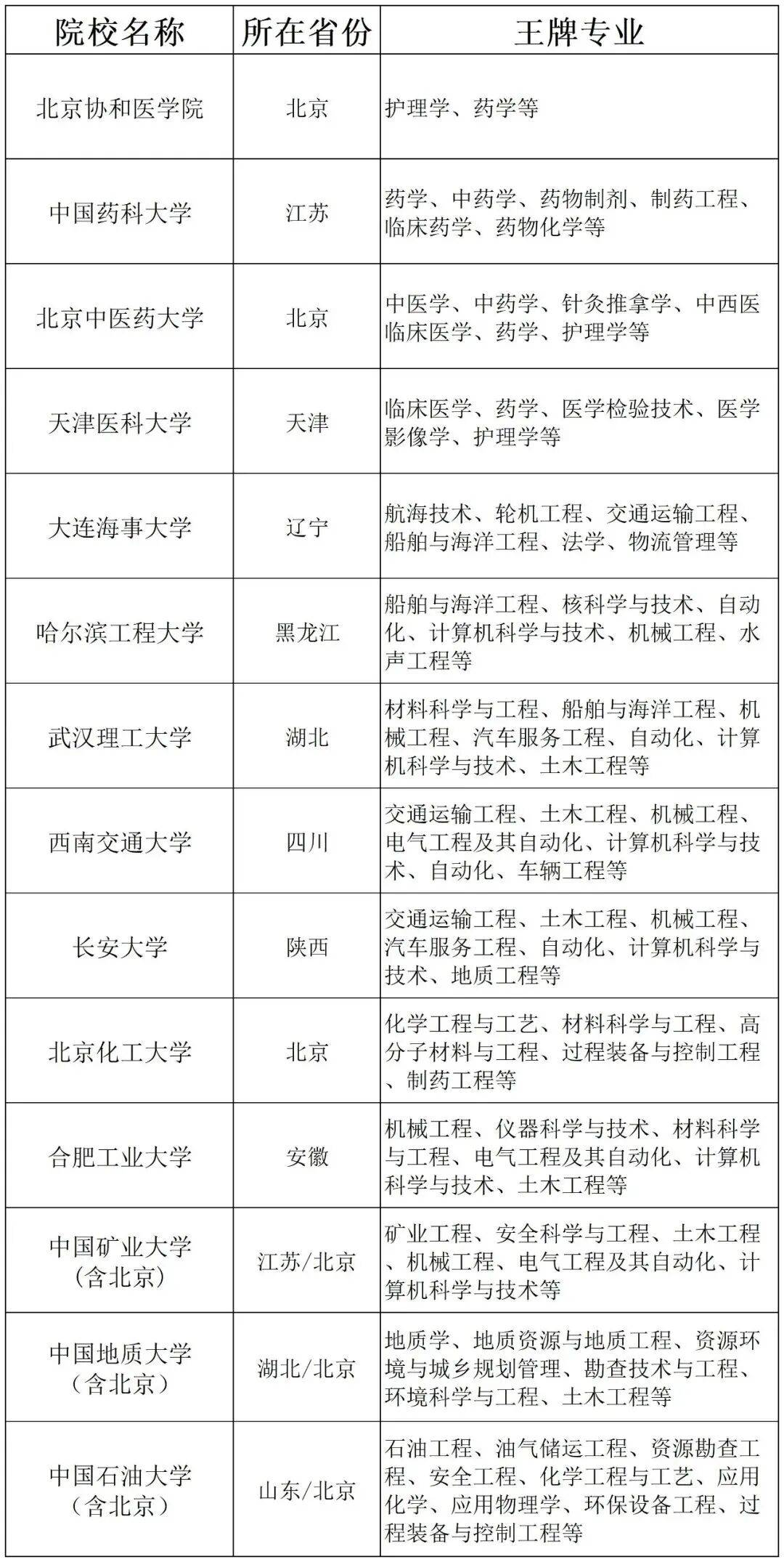协和医学院、中国药科大学、西医药大学、天津医科大学、大连海事大学、工程大学、武汉理工大学、西南交通大学、长安大学、化工大学、中国矿业大学(含)、中国地质大学(含)、中国石油大学(含)、合肥工业大学。
