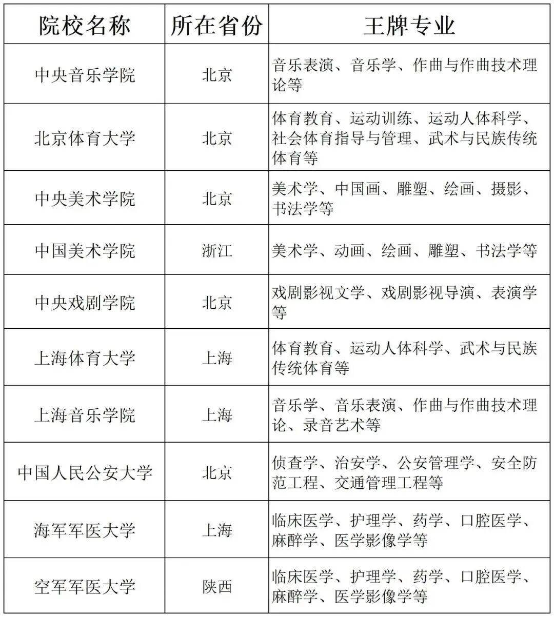 纯双一流大学的“第一梯队”,皆位于经济发财地域,正在本省市备受关心,且由于行业特色,将来就业前景优良。海军军医大学、空军军医大学、体育大学、中国人平易近大学、中国音乐学院、地方美术学院、地方戏剧学院、上海体育学院、上海音乐学院、中国美术学院。