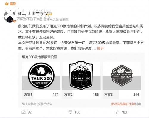 正在签约合做后,坦克品牌施行副总司理谷玉坤随即正在社交倡议“坦克300极地版”共创打算,并发布了极地版徽章设想方案,激发泛博用户投票参取。日前又发布了拉花的多种设想方案,诚挚邀请全网用户投票。后续还将有20余项共创项目连续展开。